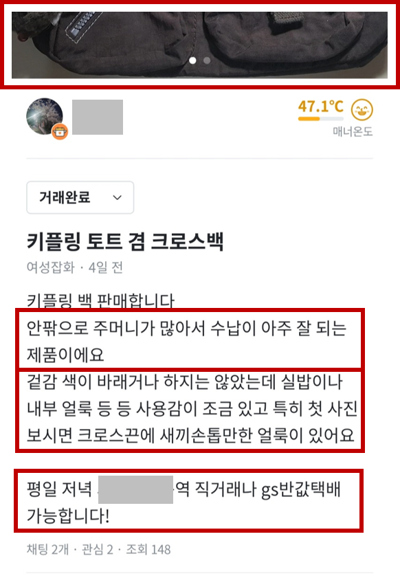 나는 특정 지하철역에서 평일 저녁 때만 가능함을 명시했다. "거래 가능한가요?"와 같은 채팅이 들어오면 "네~"하고 멈추지 않고 바로 "네! ㅇㅇ역에서 ㅇㅇ시에 가능하신가요?"로 시작한다. 조건을 워낙 명확하게 적어뒀던 터라 가부 여부에 대한 답도 빨리 오고 혹 시간은 바꾸더라도 장소를 바꾸려는 사람은 거의 없다. 낮 시간을 원한다고 하면 퇴근 후에 가야 한다고 이유를 확실히 말하니 다들 수긍한다. 대신 gs반값택배가 가능하다고 적어둬서 상대방이 내가 말한 약속 시간/장소가 어려운 경우 빠르게 택배로 선회하는 편이다. 택배 발송 후 바로 인증샷을 보내주는 매너는 꼭 지킨다.