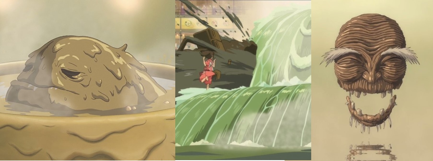 *('센과 치히로의 행방불명' 중)치히로가 일하는 온천 여관에 찾아온 오물신은 순식간에 주변을 악취로 가득하게 하고 욕탕이 검게 물들게 한다. 용기를 낸 치히로가 오물신에게 다가가서 몸에 박힌 큰 막대기(가시?)를 뽑아내자 갑자기 온갖 쓰레기가 신으로부터 떨어져 나오고, 오물신은 순식간에 청량한 강의 신으로 변신한다.