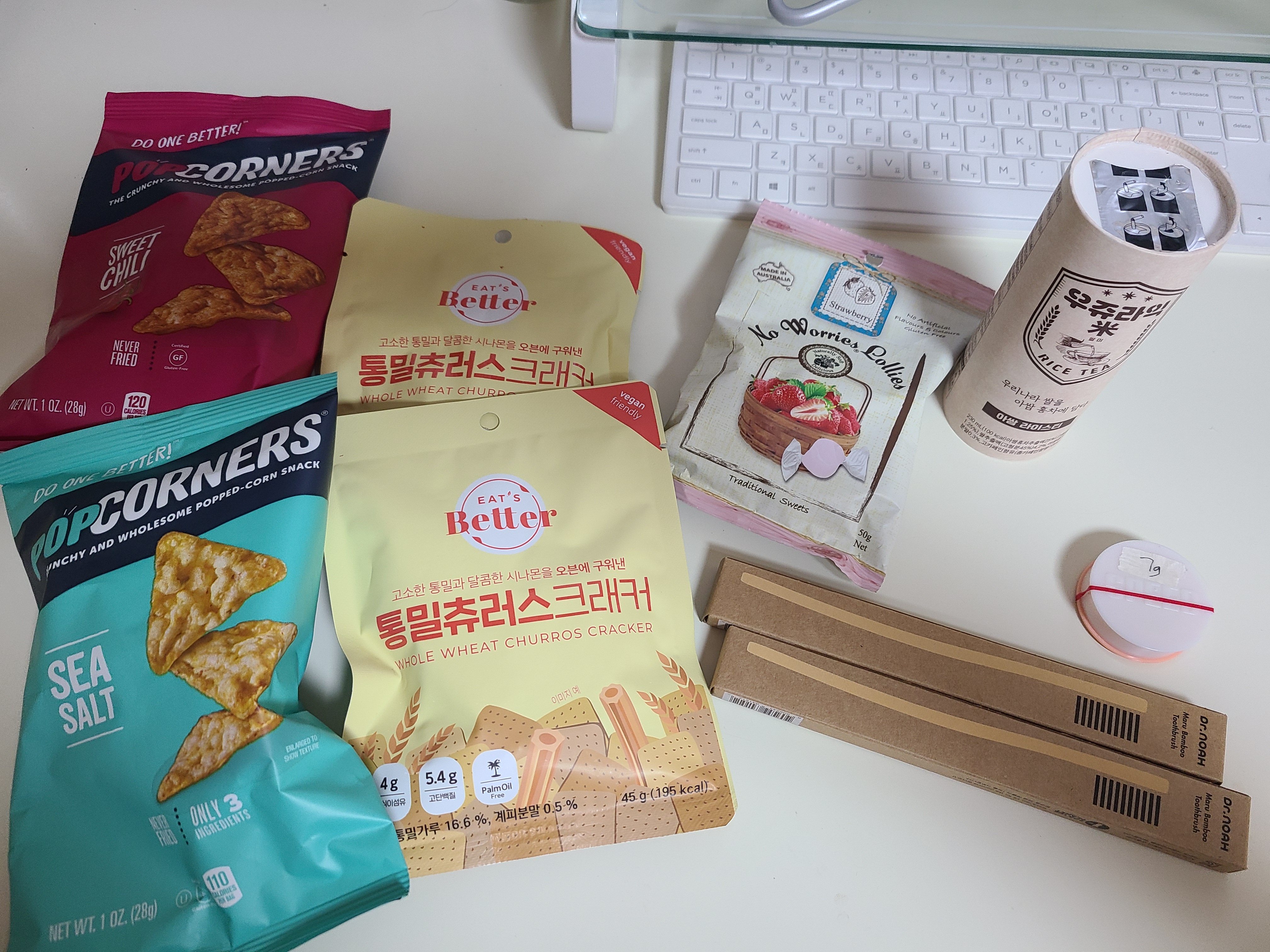 미리 준비한 용기에 멀티밤을 담고 마저 매장을 둘러보았다. 나무 칫솔을 교체할 시기가 되었으니 닥터노아의 칫솔 두 개(1개당 2800원), 남자친구에게 먹여보려 골라본 이런저런 비건 과자(통밀츄러스크래커는 1개당 3500원, 팝코너 칩은 1개당 1000원, 비건 사탕은 한 봉지에 2500원이었던가). 비그린을 카카오 플러스친구로 등록했더니 우쥬라익미 아쌈 라이스티도 하나 얻었다. 이럴 줄 알았으면 큰 장바구니를 가져오는 건데. 물건의 부피에 비해 가격은 2만 원 대여서 기분이 좋았다.