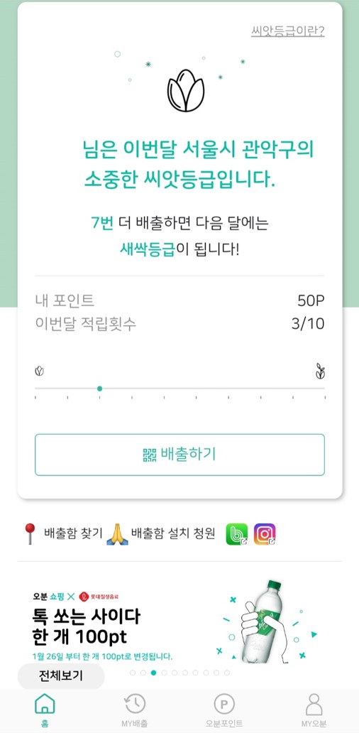 그렇게 페트병 분리수거를 실천하고 있는데 주민센터에 무려 페트병 수거 기계가 생겼다. '오늘의 분리수거' 앱을 깔아 사용할 수 있는 기계였는데, 노스페이스에서 가져가 의류 원단으로 업사이클링하는 모양이었다. 우리 구의 주요 사업에 환경 부문이 나름 들어가 있다는 사실도 알게 됐지. 어플을 사용해 페트병을 수거함에 넣으면 포인트를 주었고, 포인트를 모으면 우유나 피자 등을 어플 내에서 살 수 있었다. 리워드를 택배로 배송하는 게 좀 마음에 걸리기는 하지만(고작 하늘보리 한 병을 위한 택배라면 그 탄소발자국은 또 어째!) 나름 참여자의 구미를 당기는 좋은 방법이긴 했다.