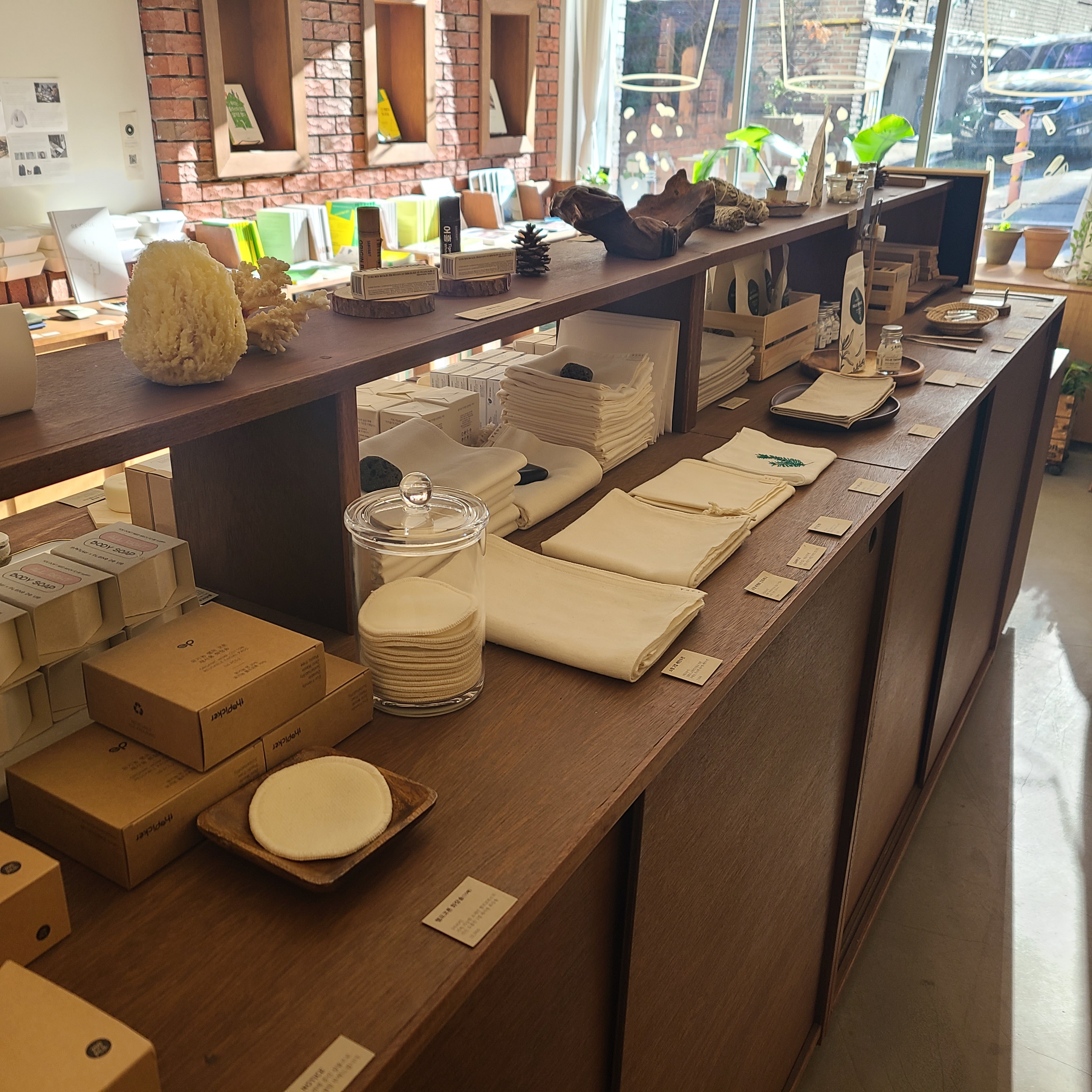 보통의 제로웨이스트샵은 생활잡화점이기에 감성적인 디스플레이를 하기는 어렵다. 더피커는 가게의 외양도 멋졌지만 우드-베이지 풍의 내부도 신선했다. 이 정도면 제로웨이스트샵이 아니라 감성 소품샵인데! 널찍한 가게 크기와 베이지-우드톤의 차분한 내부가 인상적이었다. 판매하는 물품도 미감과 실용도를 고려해 잘 큐레이션 한 느낌이었다.