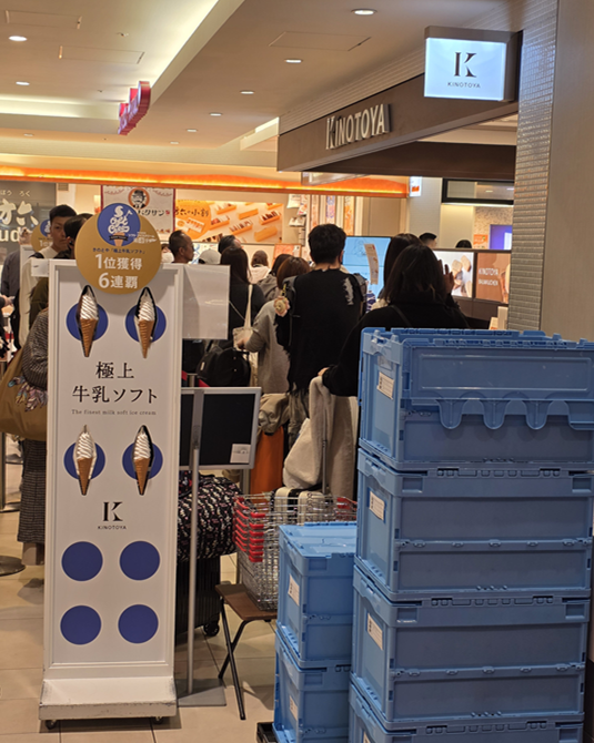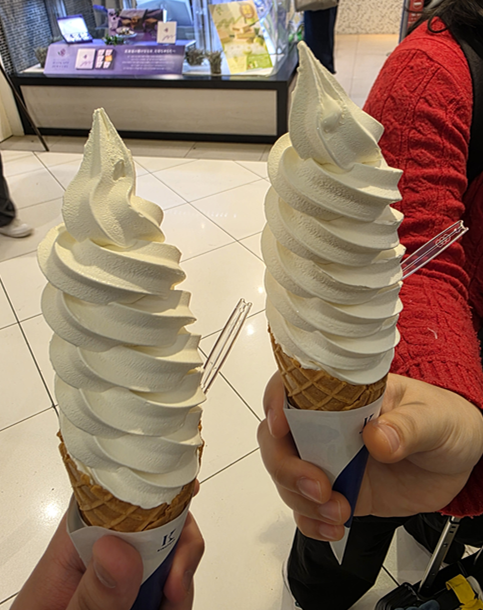 작년 신혼여행을 다녀오며 이제 5시간 비행도 하고 싶지 않다는 결론을 내렸기에 삿포로까지의 3시간 여정에도 마음의 준비가 필요했다. 우리 같은 거구에게 이코노미는 정말이지 재앙이라고! 꼼짝도 하지 않은 채 시간을 죽이고 공항에서 해방되니 두 뚱보는 이미 지쳐있었다. 이동이 이렇게 힘들었던가? 그 와중에 공항에서 입국 때 한 번, 출국 때 한 번 먹어야 한다고 추천 받은 아이스크림을 먹었다. 나의 주장으로 도착한 아이스크림 집에는 '여기서 부터 25분'이라는 팻말이 세워져 있었는데.. 다행히 10분 이내로 기다려 아이스크림을 받았다. 우유맛이 진한 맛도리라 만족스러웠다.